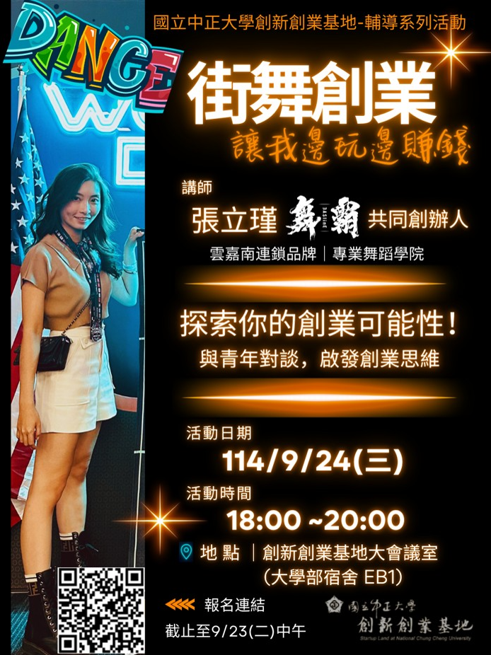 近期創新創業基地即將舉辦 街舞創業:邊玩邊賺錢講座,詳細資訊在下方,歡迎踴躍報名~