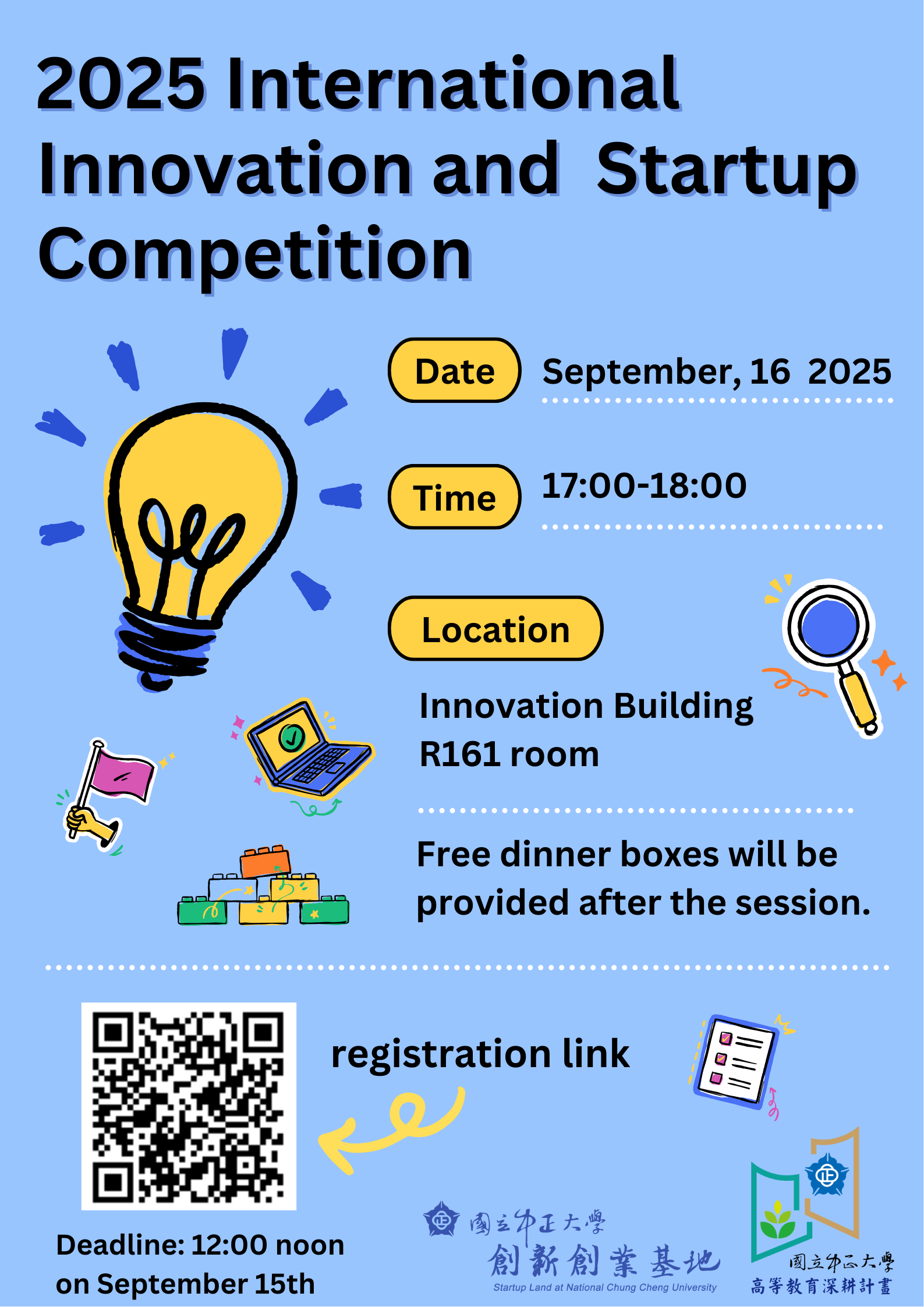 Hello! CCU Startup Land is about to hold the 2025 International Innovation and Startup Competition. Let's unleash our creativity, apply what we've learned, and turn ideas into possibilities! Interested in learning more about the competition? If you haven't found a team yet, feel free to join us for the competition briefing! We will help you find your teammates to form a team.