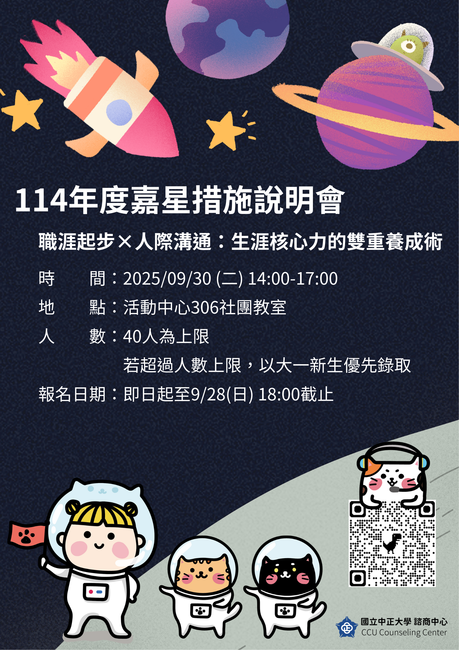 各位嘉星的孩子們,移居到中正大學的生活過的還適應嗎?對於新的生活圈探索了多少了呢?對於自己未來四年的生活與生涯有怎樣的想法與安排嗎?在中正大學這裡有各式各樣的資源,不必過度煩惱家庭經濟可能會恪絆住自己追逐夢想的腳步,也不用過度擔心在中正大公園奔跑築夢開銷過多,導致月底發文詢問哪片鳳梨田的土比較好吃。一起來參加嘉星計劃吧!在這裡,你可能可以挖到石油、飛上太空,雖然沒辦法讓你發家致富,但可以讓你衣食無虞的好好學習,透過這次活動瞭解嘉星計畫所提供的資源,以及結合行動心理師─謝文軒老師一起來帶領大家整合資源進行生涯規劃,”你有想法,我們有辦法”,帶你一起實現生涯夢想!