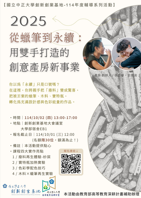 創新創業基地即將舉辦【從蠟筆到永續:用雙手打造的創意產房新事業】,