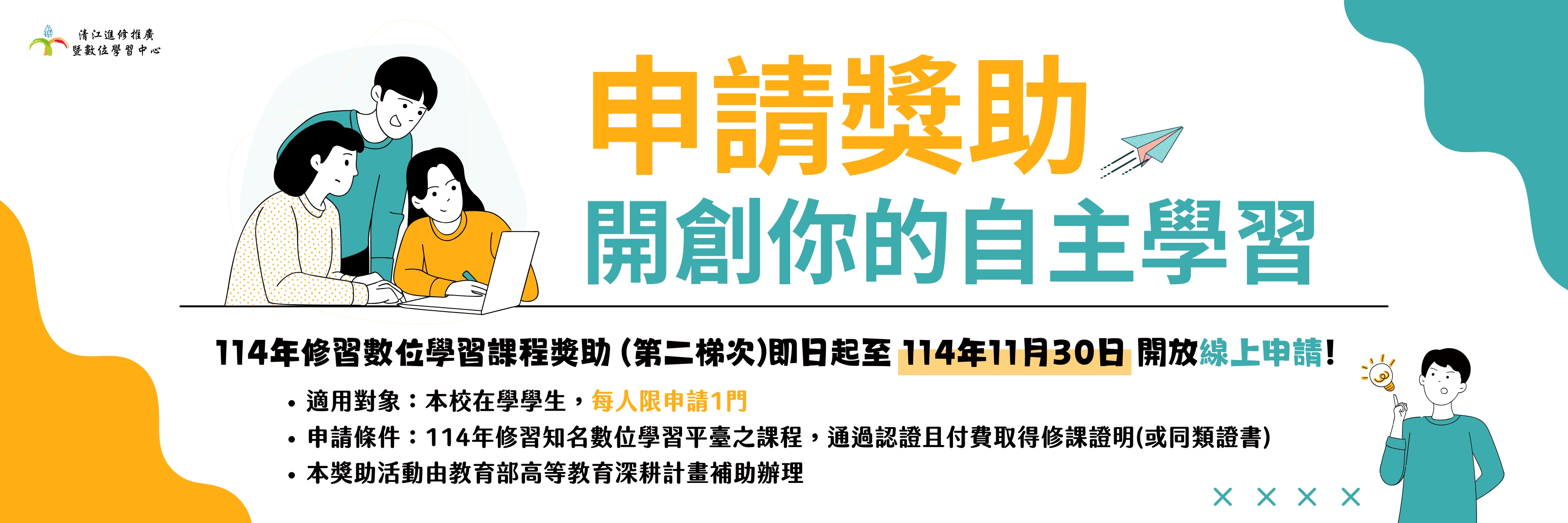 為培養學生線上自主學習能力,鼓勵修讀國內及國外線上數位學習平臺課程,本校清江進修推廣暨數位學習中心特辦理「修習數位學習課程獎助申請」,每門課程獎助新臺幣2,000元,每人限申請一門!