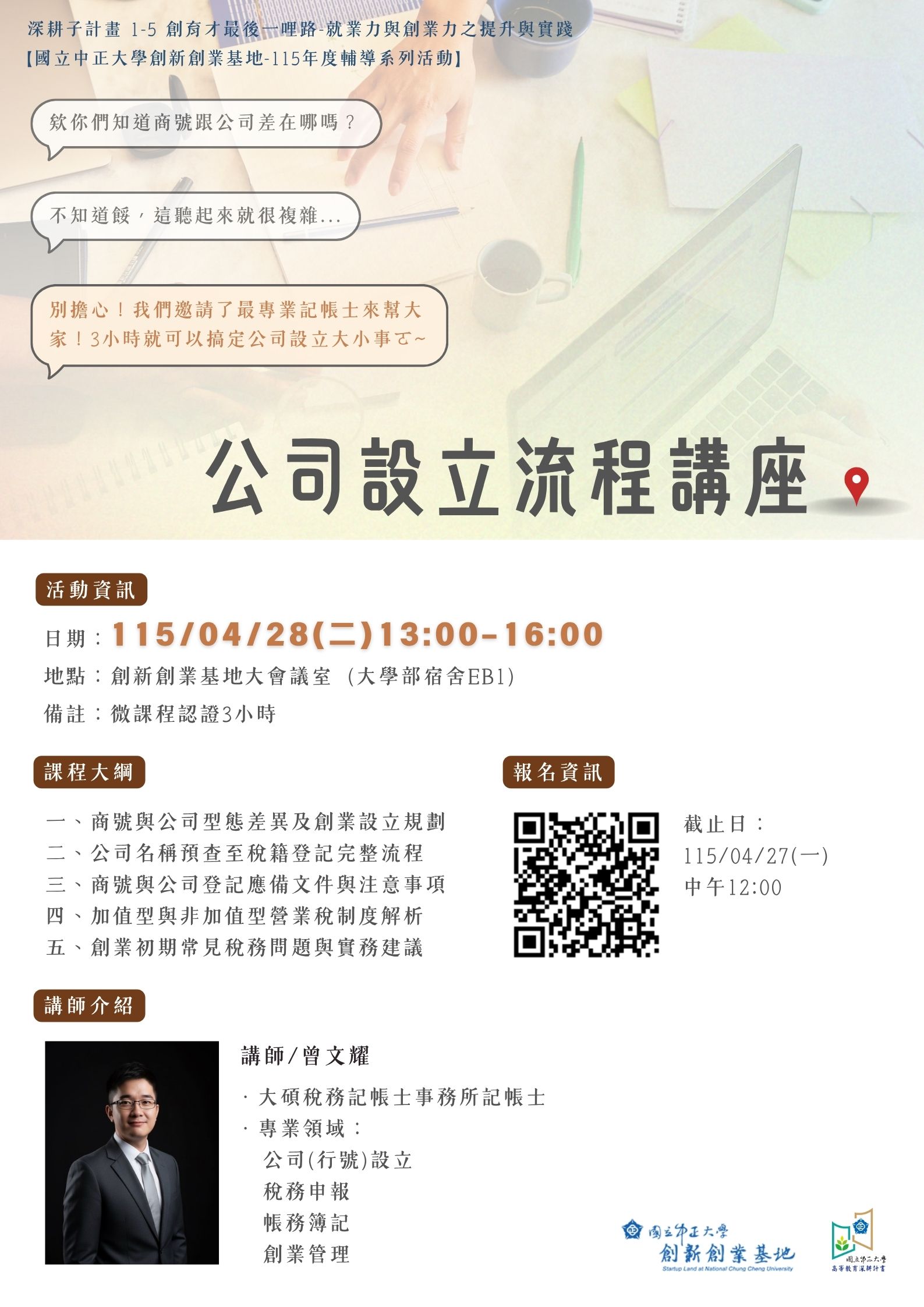 別擔心!創新創業基地邀請了大碩稅務的專業記帳士—曾文耀講師,用3小時幫你打通關!從公司取名到稅籍登記,手把手帶你避開新手最容易踩的坑。