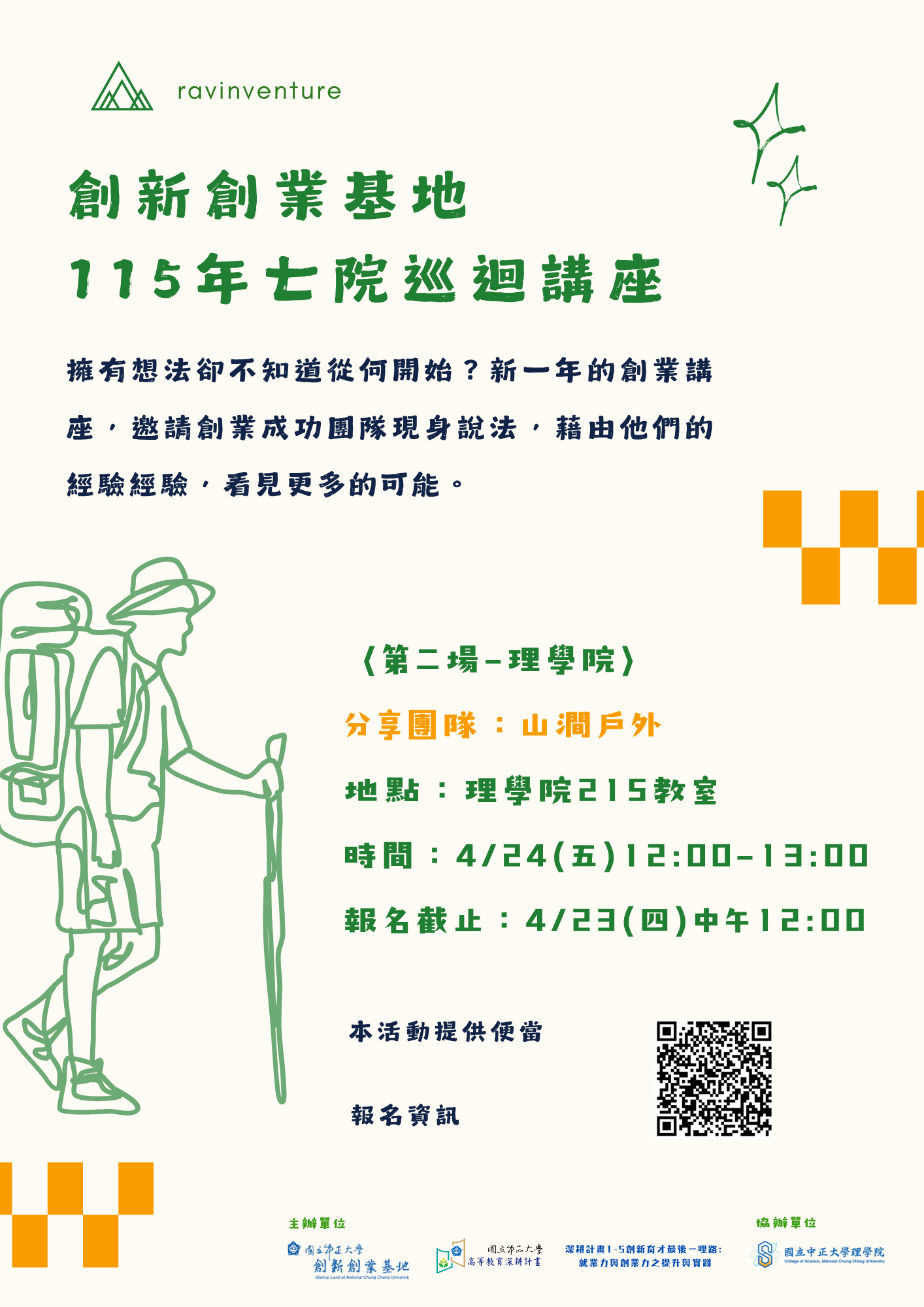 本次理學院場,我們特別邀請到由創基輔導的學生團隊「山澗戶外」 團隊。將分享如何融合原住民文化視野、戶外專業證照與活動策劃能力,打造出獨具特色的文化體驗行程,拓展國際觀光市場的創業實戰。